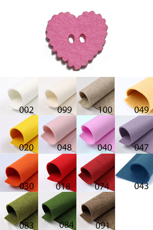 002 – Bianco, 008 – Celeste, 018 – Rosso, 020 – Giallo, 030 – Arancio, 040 – Fucsia, 043 – Ottanio, 047 – Lilla, 048 – Rosa, 049 – Giallino, 074 – Rosso Melange, 083 – Verde Chiaro, 084 – Verde Scuro, 091 – Marrone Melange, 099 – Panna, 100 – Panna Melange
