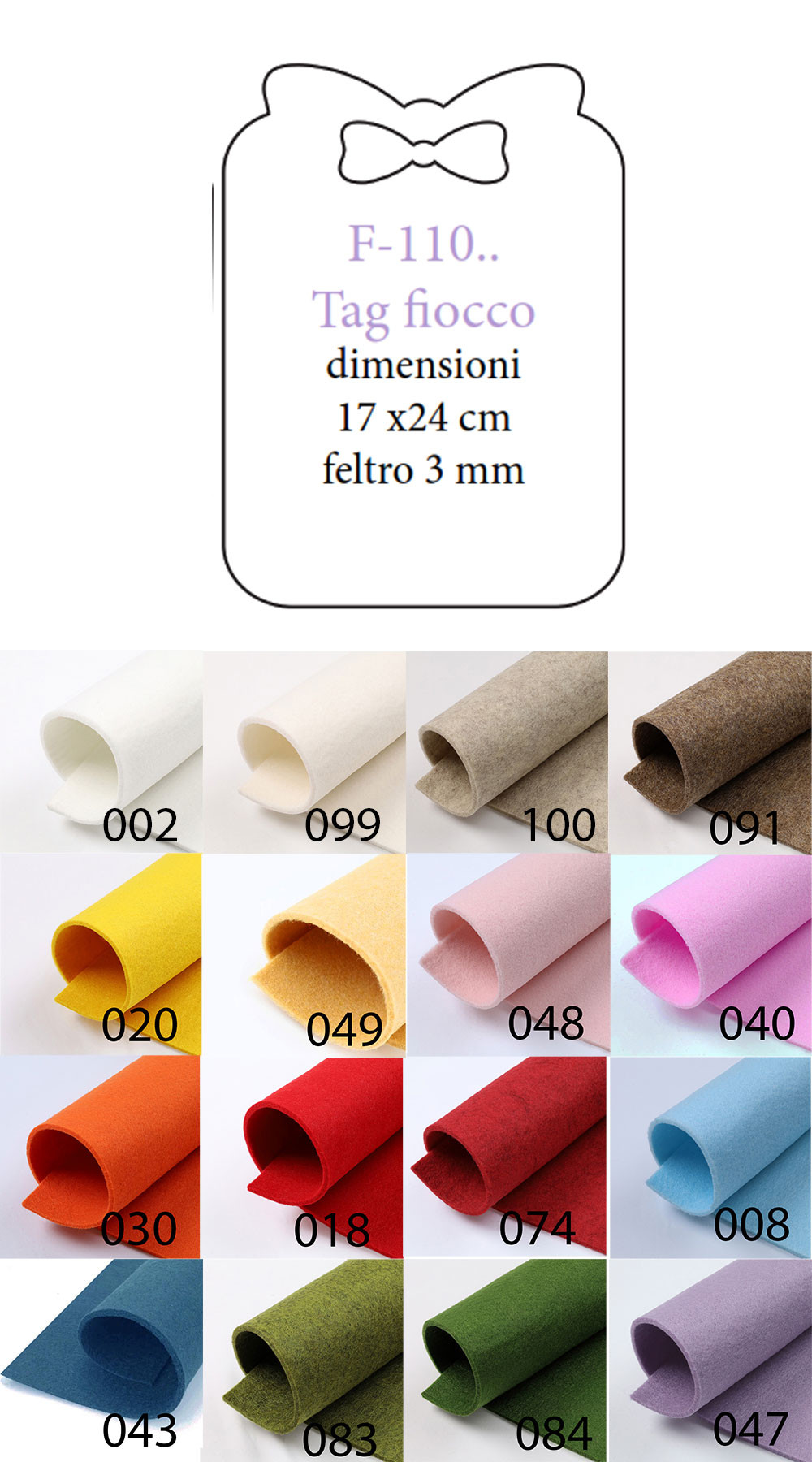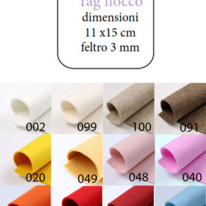 | Colore | 002 – Bianco, 008 – Celeste, 018 – Rosso, 020 – Giallo, 030 – Arancio, 040 – Fucsia, 043 – Ottanio, 047 – Lilla, 048 – Rosa, 049 – Giallino, 074 – Rosso Melange, 083 – Verde Chiaro, 084 – Verde Scuro, 091 – Marrone melange, 099 – Avorio, 100 – Panna Melange, 1458 – Panna |